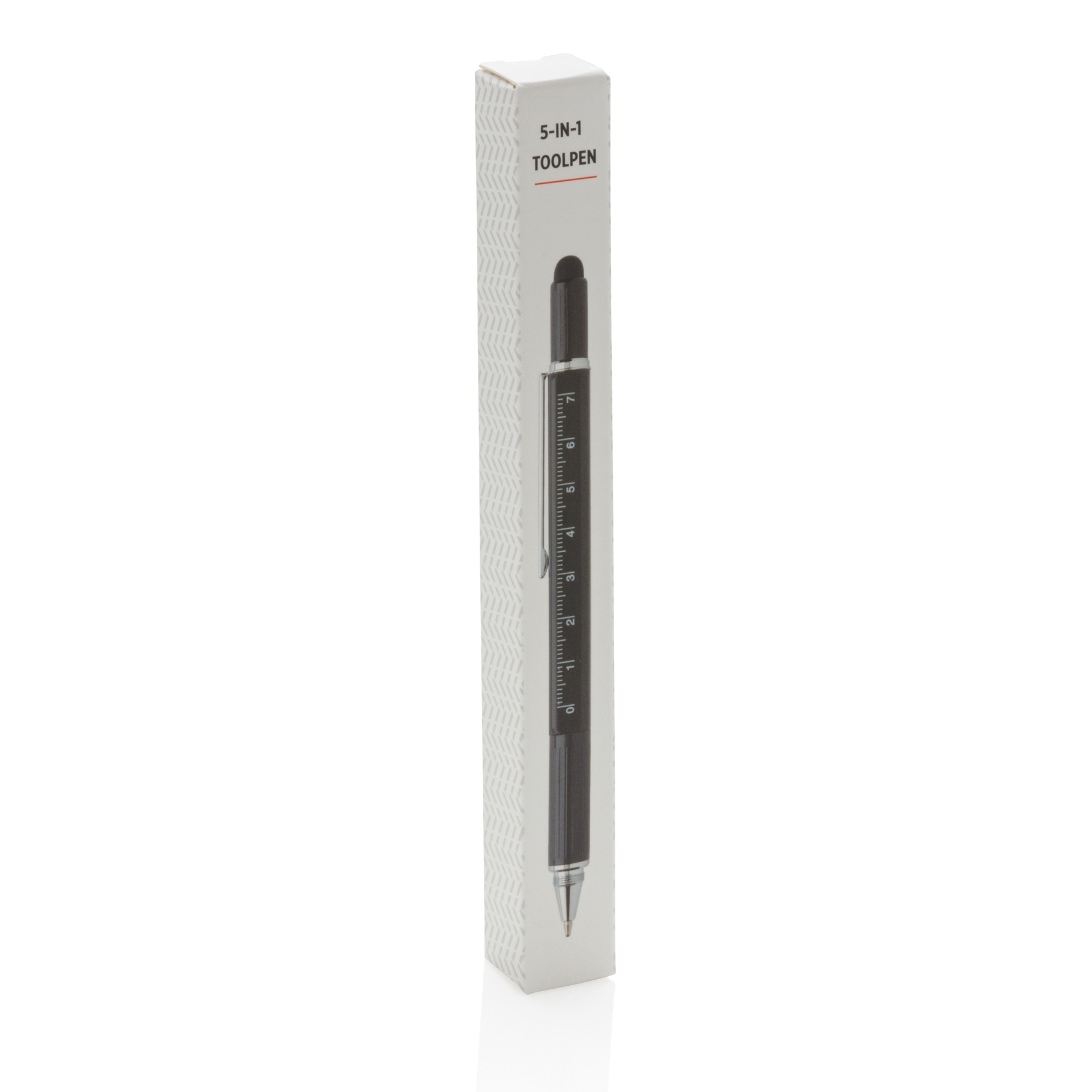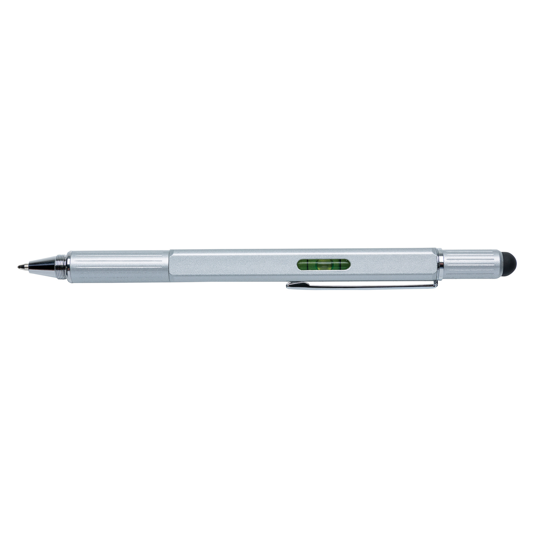 Multifunction pen with ruler (7cm) , spirit level, screw driver, stylus tip and ballpoint with blue writing ink (up to 400m) Made out of high quality brass material with aluminium clip