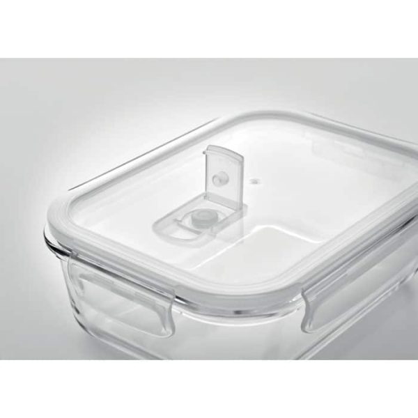 High borosilicate glass lunchbox with air tight locking lid in PP. Suitable for microwave. Capacity 900 ml.