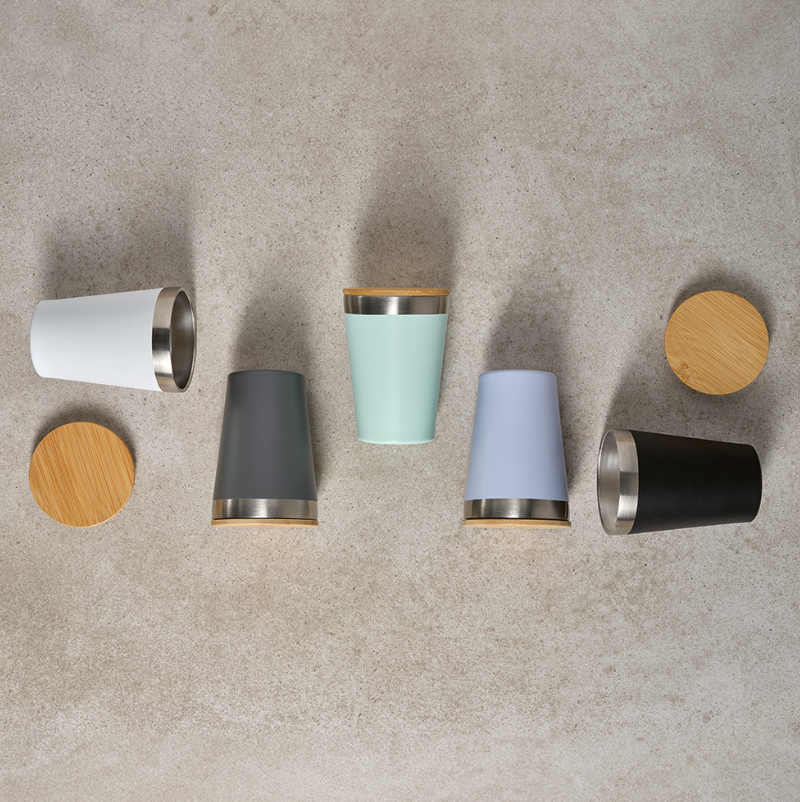 Tvöfaldur stálbolli með bambusloki. Rúmar 400 ml. Bollinn er framleiddur úr endurunnu stáli. Fæst í fimm mismunandi litum (hvítum, svörtum, dökkgráum, ljóslillabláum og ljósmyntugrænum). Hægt að merkja bæði bolla og lok. Þvermál: 8,8 cm, hæð: 12,7 cm. Þyngd: 300 g. Bollinn heldur heitu í sex klukkustundir og köldu í allt að 18 klukkustundir.
