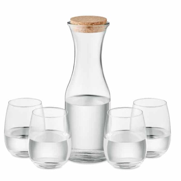 Recycled glass drink set. Including: Carafe (1L) with cork lid and 4 glasses (420 ml)