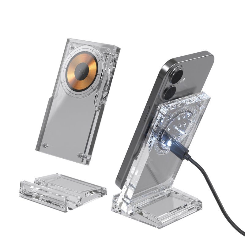 Þráðlaus segulhleðslustandur, 15W. Hentar fyrir síma sem geta tekið við þráðlausri segulhleðslu. Sterkur segull tryggir að síminn sé rétt staðsettur með tillliti til hleðslu. Framleiddur úr glærum akrýl. Að baki býr vönduð hönnun sem sameinar bæði notagildi og fegurð. Hleðslustandinn er bæði hægt að merkja og nafnamerkja. Með standinum fylgir 120 cm USB-C hraðhleðslusnúra. Kemur í FSC-vottaðri pappaöskju. Stærð: 6,9 x 7,2 x 12,4 cm [breidd x dýpt x hæð]. Þyngd: 215 g.