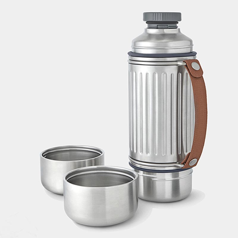 Þessi lofttæmda einangraða og ryðfría stálflaska er hönnuð fyrir alls kyns ævintýri – hvort sem þú ert að fara út í göngu, slaka á í náttúrunni eða fara á skíði. Með vandaðri og endingargóðri hönnun heldur hún drykkjum sjóðandi heitum eða ísköldum í allt að 24 klukkustundir. Hún er alveg lekaheld, með stálloki. Auðvelt er að hella úr henni og 2 tvöfaldir hitabollar fylgja með. Bollarnir eru stöðugir á ójöfnu undirlagi. Flöskuna má þvo í uppþvottavél þegar ólin hefur verið fjarlægð. Flaskan tekur 1 lítra.